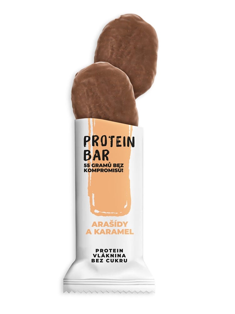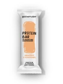 PROTEIN BAR Arašídy a karamel Výživové hodnoty na 100 g: Energetická hodnota 1421 kJ / 339,7 kcal, Tuky 14,1 g, z toho nasycené 5,7 g, Sacharidy 11,1 g, z toho cukry 3,1 g, Vláknina 26,1 g, Bílkoviny 25,2 g, Sůl 0,2 g