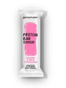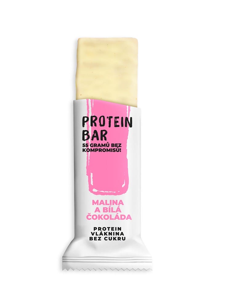 PROTEIN BAR Malina a bílá čokoláda Výživové hodnoty na 100g: Energetická hodnota 1564 kJ / 374 kcal, Tuky 14,5 g, z toho nasycené 4,8 g, Sacharidy 25,2 g, z toho cukry 10,2 g, Vláknina 20 g, Bílkoviny 27,8 g, Sůl 0,2 g