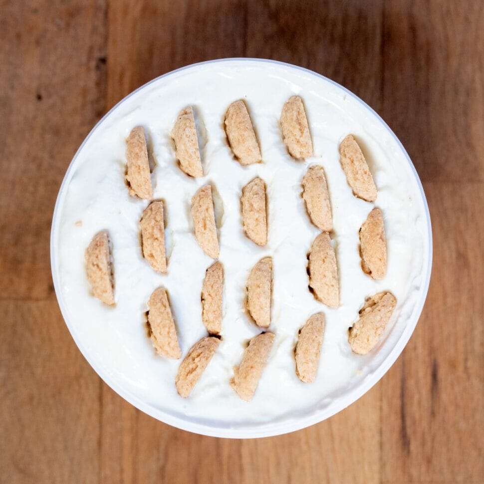 1. Sušenky zatlač přímo do jogurtu tak, aby byly celé ponořené.