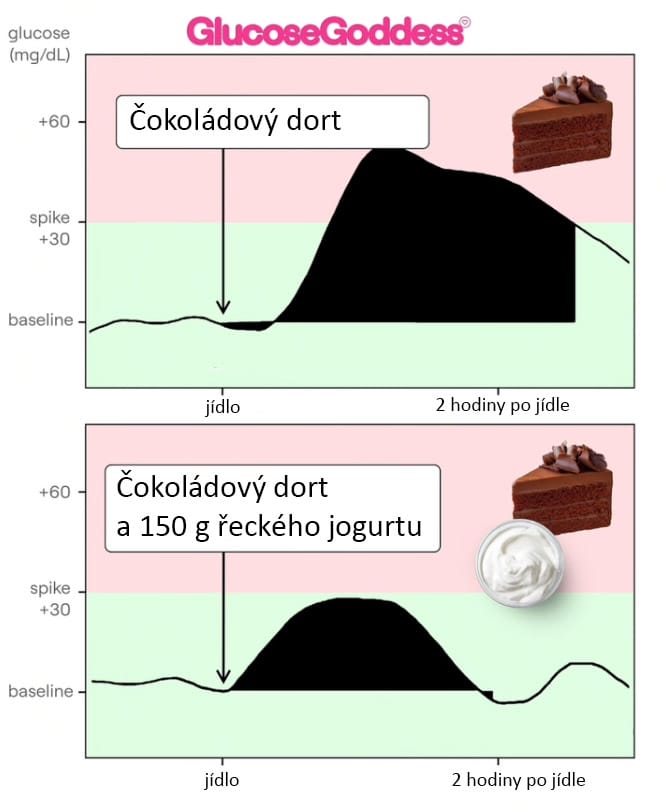 Když ale ke stejným sacharidům přidáte bílkoviny, tuk a vlákninu, tedy oblečete je, jak jsme si řekli o pár řádek výše, reakce těla se právě podle měření Jessie Inchauspé dramaticky změní. Cukr vystoupá jen o třetinu, třeba jen o 15 až 30 mg/dl. Bez raketového nástupu. Bez následného pádu. Tedy i bez hormonálního chaosu.